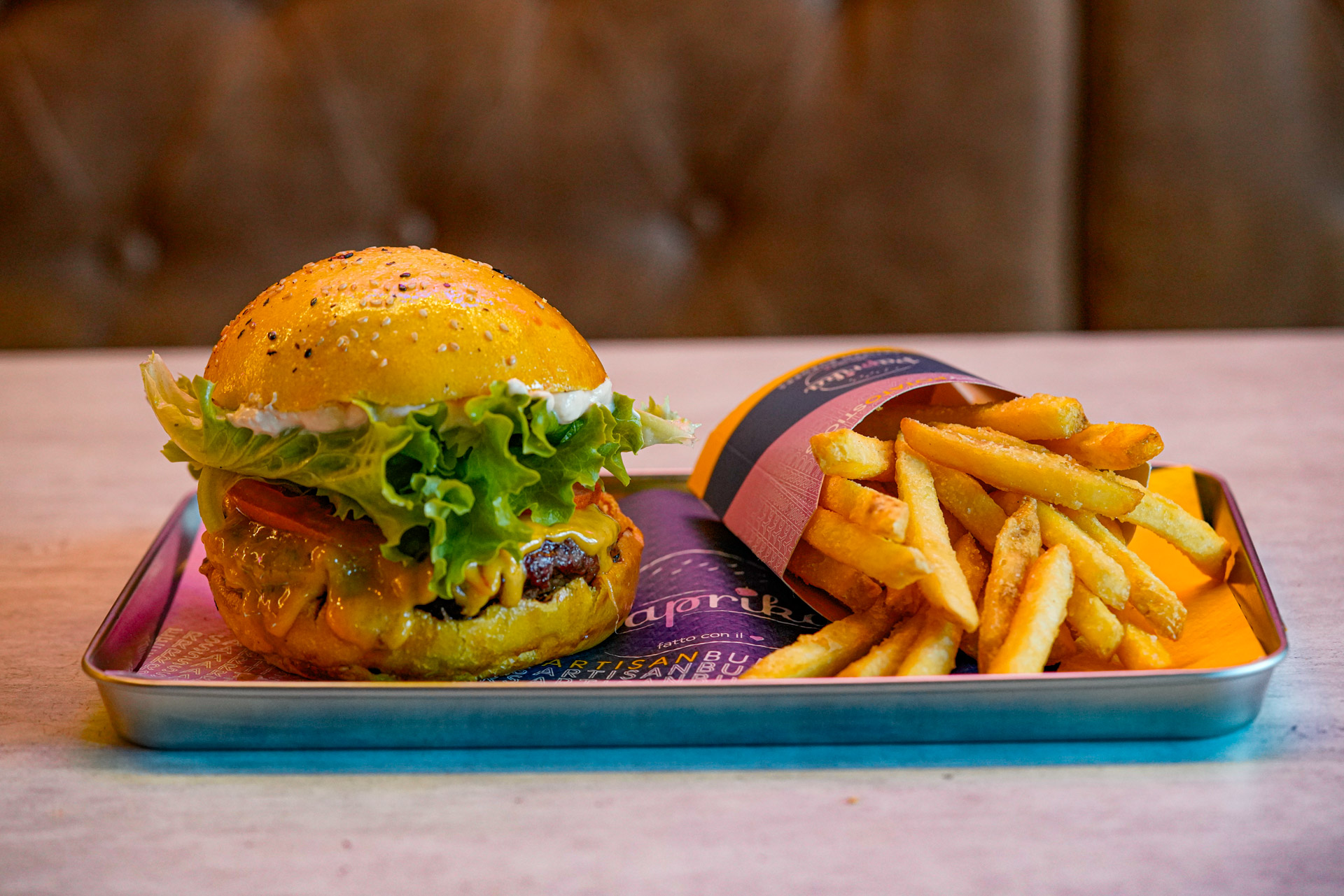 Manzo cotto a bassa temperatura e leggermente affumicato servito nel nostro “Yellow bun” con insalata croccante americana e patatine