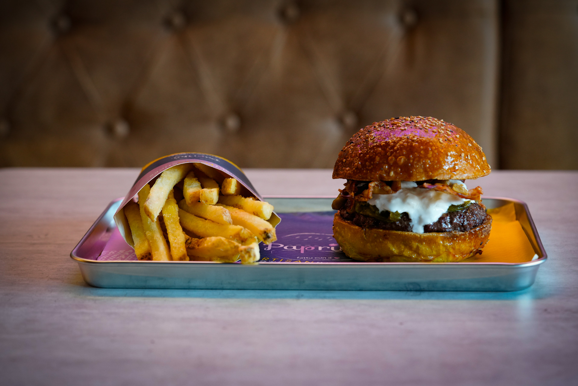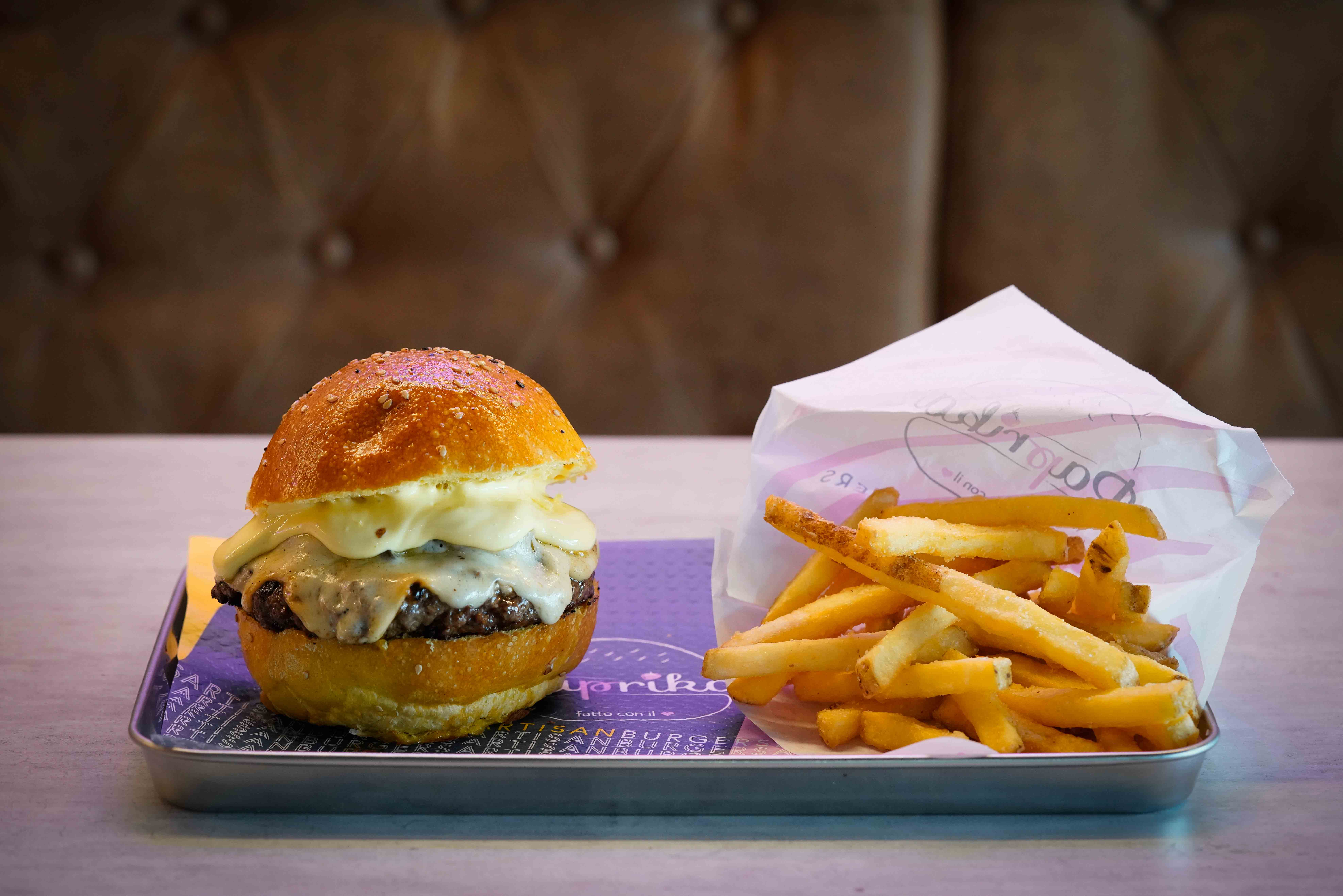 Doppio cheeseburger, pancetta croccante, cipolla caramellata, salsa Paprika con un tocco piccante