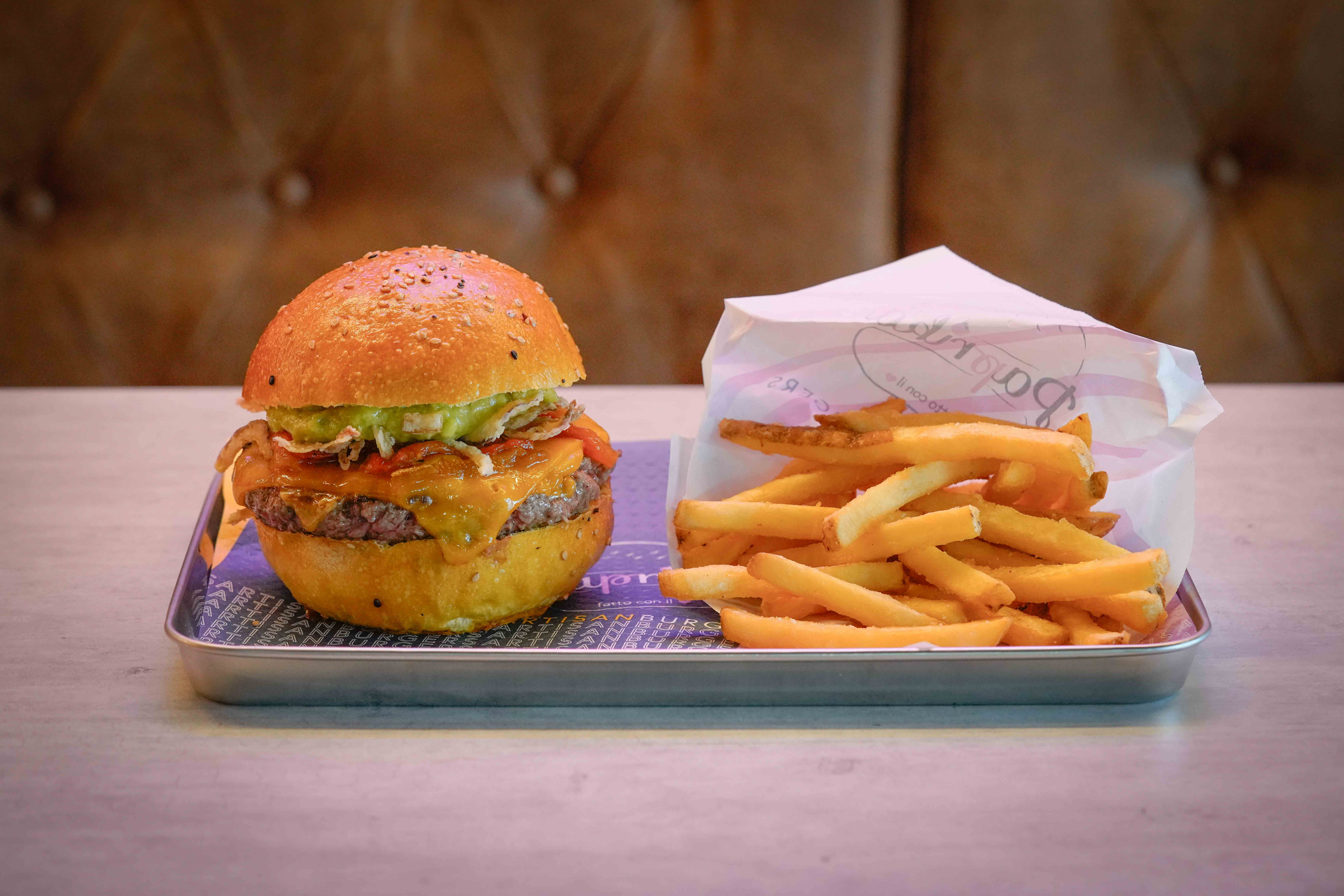 Burger di scottona, doppio Cheddar stagionato, Guacamole homemade, peperoni arrostiti piccanti