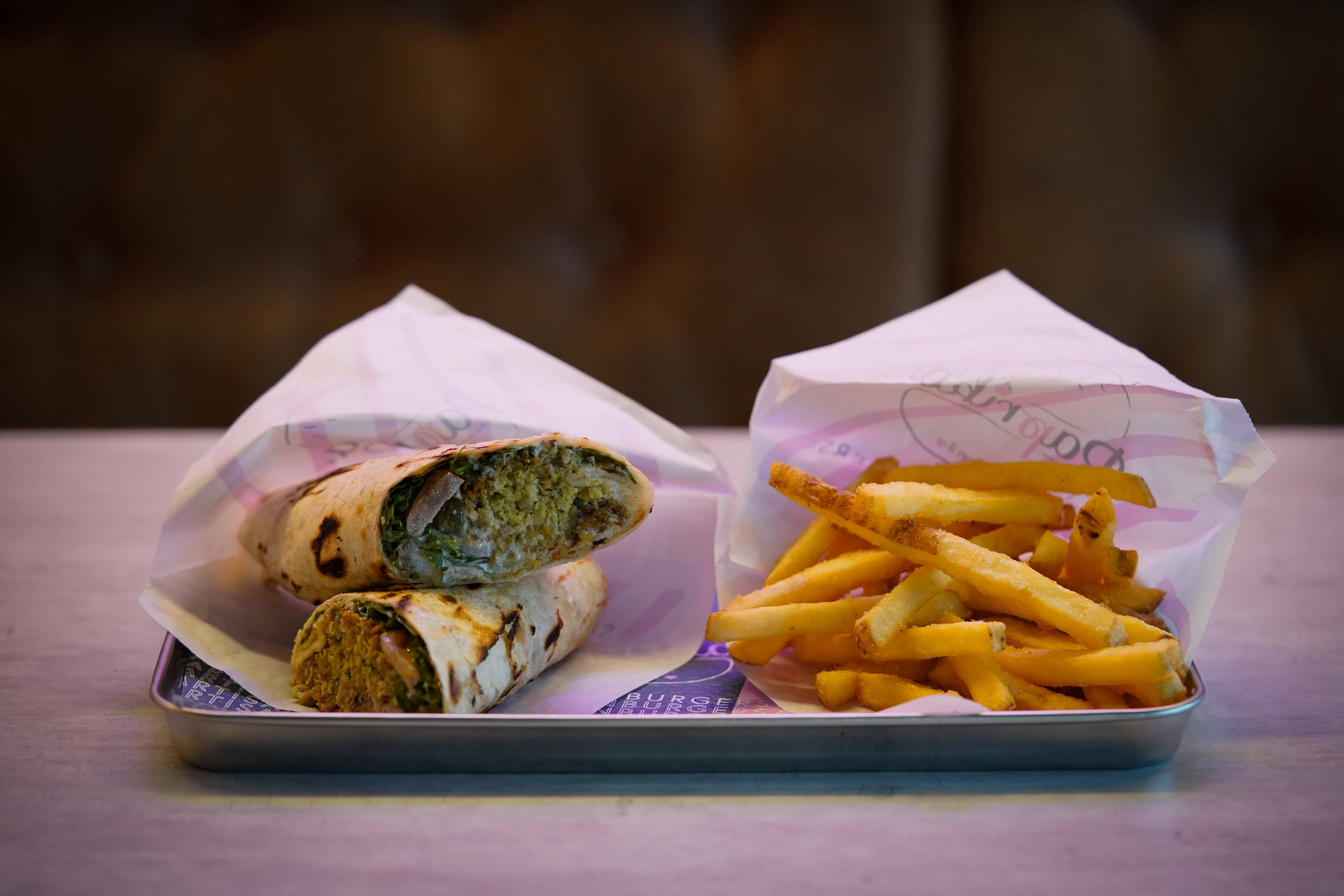 Fragrante piadina artigianale con Felaffel homemade, salsa vegan alle erbe, rucola e cetriolini