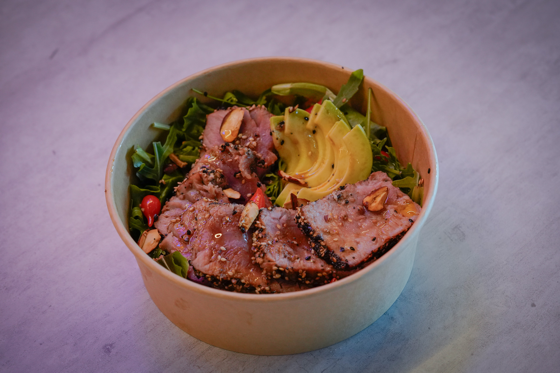 Tonno rosso scottato con salsa di soia e sesamo, insalata di rucola, pomodorini in agrodolce, lamelle di mandorle