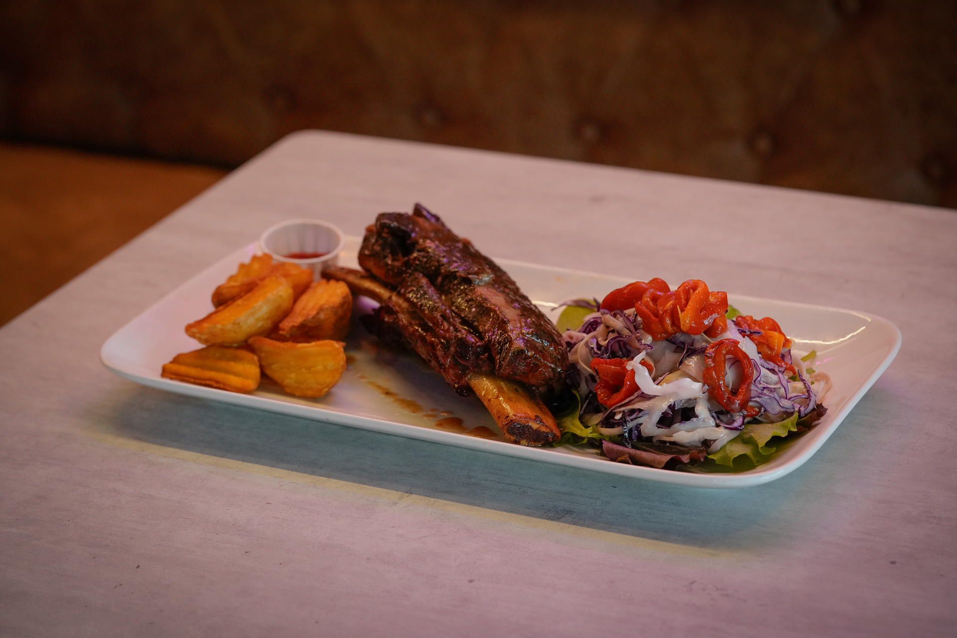 Costata di manzo cotta a bassa temperatura stile BBq servita con patate a spicchi e verdurine